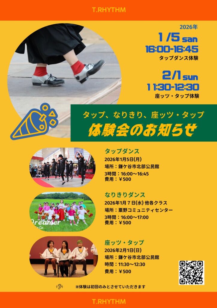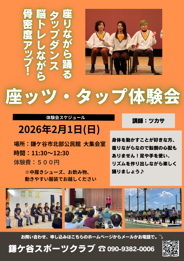 開催予定 座ッツ・タップ体験会 募集中 2025.12.12 開催予定 2026年2月1日(日)、鎌ケ谷市北部公民会 大集会室にて、体験会を実施いたします。 大人のスポーツテストを行いました 前の記事 お知らせ新着 大人のスポーツテストを行いました 2025.10.14 鎌ケ谷市民まつりに出店 2025.10.11 2025年10月13日(月/祝日)大人のスポーツテスト実施 2025.10.06